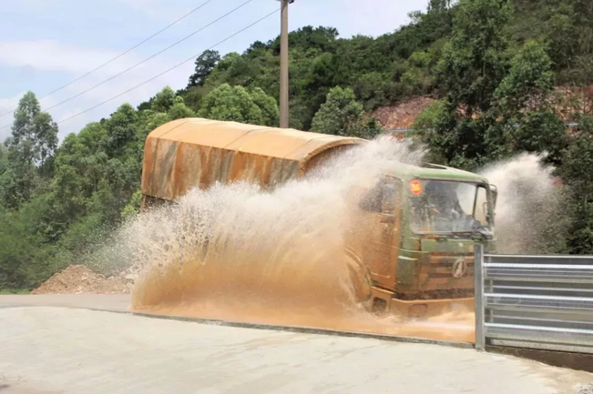 運(yùn)輸車駛?cè)胨系K路段掀起水浪