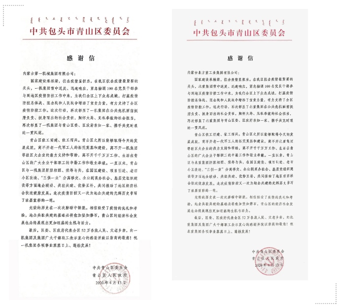 近日,中國兵器工業(yè)集團豫西集團鄭州紅宇專汽公司、一機集團和北重集團分別收到國務院應對新型冠狀病毒肺炎疫情聯(lián)防聯(lián)控機制醫(yī)療物資保障組,包頭市青山區(qū)委、區(qū)政府發(fā)來的感謝信、慰問信,對他們在打贏疫情防控人民戰(zhàn)爭、總體戰(zhàn)、阻擊戰(zhàn)中作出的貢獻表示感謝。 豫西集團鄭州紅宇專汽公司收到國務院聯(lián)防聯(lián)控機制感謝信 4月14日,國務院應對新型冠狀病毒肺炎疫情聯(lián)防聯(lián)控機制醫(yī)療物資保障組向中國兵器工業(yè)集團豫西集團鄭州紅宇專汽公司發(fā)來感謝信。 豫西集團鄭州紅宇專汽公司收到國務院應對新型冠狀病毒肺炎疫情聯(lián)防聯(lián)控機制醫(yī)療物資保障組發(fā)來的感謝信 信中指出,新冠肺炎疫情發(fā)生以來,在以習近平同志為核心的黨中央堅強領(lǐng)導下,全國上下各條戰(zhàn)線緊急動員、各司其職、主動擔責,及時采取有效措施遏制疫情擴散蔓延勢頭,堅決打好疫情防控的人民戰(zhàn)爭、總體戰(zhàn)、阻擊戰(zhàn)。 特別是在醫(yī)療物資保供戰(zhàn)中,鄭州紅宇專汽公司牢固樹立“生命重于泰山、疫情就是命令、防控就是責任”的思想,第一時間響應國家號召,積極履行社會責任,識大體、顧大局,努力克服用工短缺、物流停運、成本上漲等困難,在疫情防控的關(guān)鍵時期連續(xù)超負荷生產(chǎn),出色完成了國務院聯(lián)防聯(lián)控機制醫(yī)療物資保障組下達的醫(yī)療廢物轉(zhuǎn)運車生產(chǎn)任務,有力保障了全國特別是湖北武漢等重點地區(qū)的疫情防控需求。公司全體員工舍小家為大家、爭分奪秒、加班加點,夜以繼日奮戰(zhàn)在生產(chǎn)保供一線,用自己特有的方式支持疫情防控,為打贏疫情防控阻擊戰(zhàn)作出了突出貢獻。 鄭州紅宇專汽公司緊急生產(chǎn)醫(yī)療廢物轉(zhuǎn)運車并及時發(fā)運 疫情發(fā)生以來,鄭州紅宇專汽公司已簽約醫(yī)療廢物轉(zhuǎn)運車107臺,累計下線90臺,交付83臺。 一機集團和北重集團收到中共包頭市青山區(qū)委員會、青山區(qū)人民政府發(fā)來的感謝信和慰問信 4月13日,中共包頭市青山區(qū)委員會、青山區(qū)人民政府向中國兵器工業(yè)集團一機集團和北重集團發(fā)來感謝信和慰問信,對參與青山區(qū)防控疫情一線工作的一機集團、北重集團黨員干部職工及給予充分理解、全力支持的家屬們,表示衷心的感謝并致以最崇高的敬意!