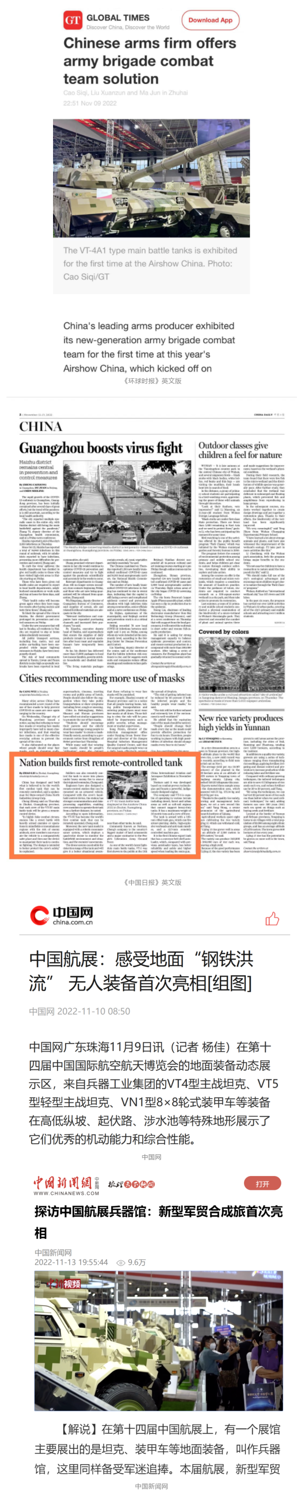 央視國防軍事頻道航展特別報道《炫舞天地間》11月12日《賞“鐵甲雄風(fēng)”!看航展地面裝備“鋼鐵洪流”名場面》對兵器工業(yè)集團武器裝備特色亮點進行報道?!秶儡娛略鐖蟆?1月7日推出報道《第十四屆中國國際航空航天博覽會明天開幕 中國兵器館首次以陸軍合成旅實戰(zhàn)體系形式展出》,對兵器館陸軍合成旅實戰(zhàn)體系進行報道。《軍事報道》11月9日推出《第十四屆中國國際航空航天博覽會 地面兵器裝備首次聯(lián)合陸航直升機進行動態(tài)展示》報道。《軍迷行天下》11月9日推出報道《軍迷打卡航展2022》以專業(yè)軍迷視角探館兵器館,全面展示兵器工業(yè)集團參展裝備特色亮點。