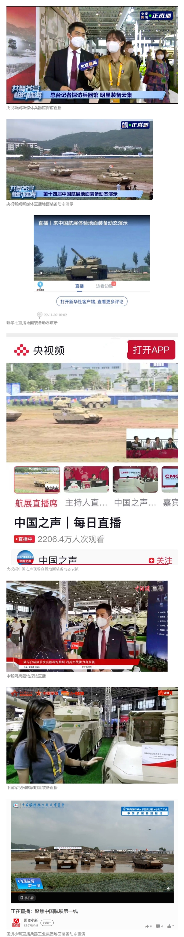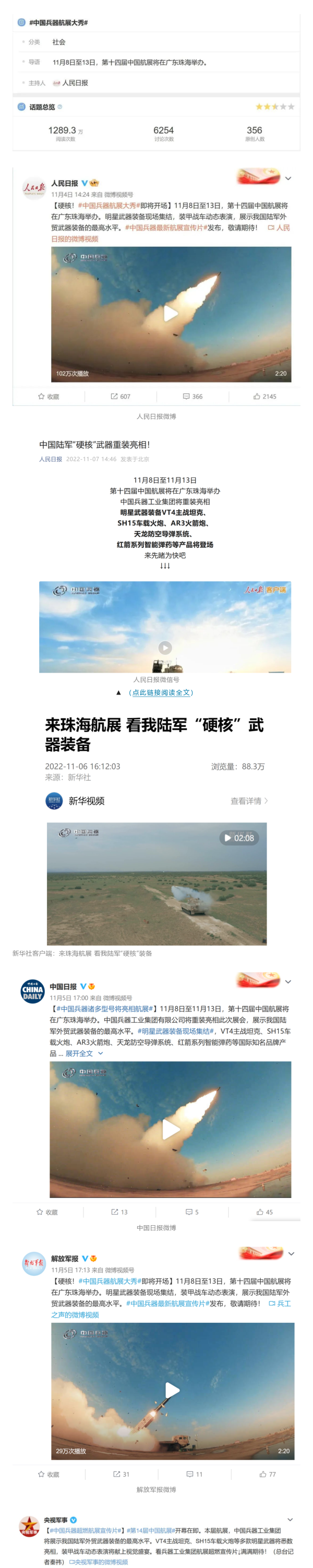 人民日報官方微博、微信公眾號,新華社客戶端、央視新聞客戶端、中國日報微博、參考消息微信公眾號、解放軍報微博、央視軍事微博、CGTN微博、中國軍號微博、共青團中央微博、環(huán)球時報(英文網(wǎng)站、臉書賬號、推特賬號)、嗶哩嗶哩、學(xué)習(xí)強國平臺、國資小新視頻號、網(wǎng)易軍事、騰訊軍事、鳳凰軍事、北京日報、東方衛(wèi)視看看新聞全媒體、北京電視臺等20余家中央主流媒體、國家部委、省市媒體的新媒體第一時間播發(fā)集團公司航展宣傳片等視頻作品燃爆全網(wǎng),累計閱讀量突破1700萬人次。集團公司微信公眾號、微博、抖音號、快手號、微信視頻號、知乎號等新媒體宣傳片播放閱讀量超過800萬人次,點贊超過30萬人次。集團公司微信公眾號推出《硬核!中國兵器最新航展宣傳片發(fā)布》《中國兵器航展節(jié)目單,請選出心中明星裝備》《航展首日,中國兵器閃耀亮相!》等7篇報道,閱讀量超過25萬人次,集團公司微信視頻號、抖音號、快手號等新媒體賬號發(fā)布“中國兵器航展大秀”系列視頻,觀看量超過330萬人次。