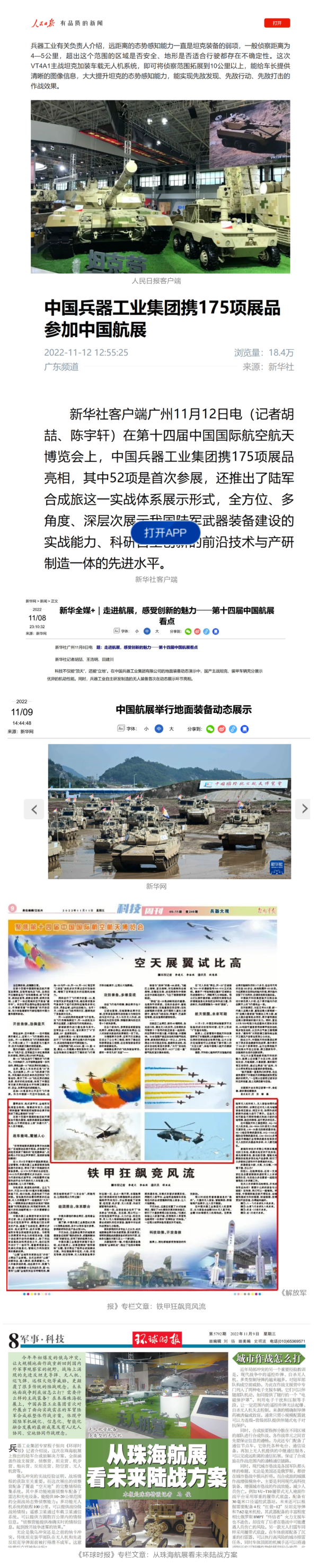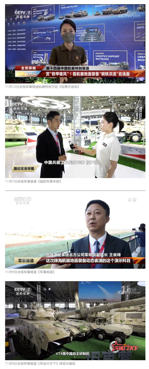 此次航展,央視新聞頻道《朝聞天下》《新聞直播間》《東方時空》《共同關(guān)注》《新聞30分》《24小時》、央視國防軍事頻道《國防軍事早報》《軍事報道》《軍迷行天下》、央視國際頻道《中國新聞》《今日環(huán)球》等欄目共播出兵器工業(yè)集團參展相關(guān)新聞報道30余條。