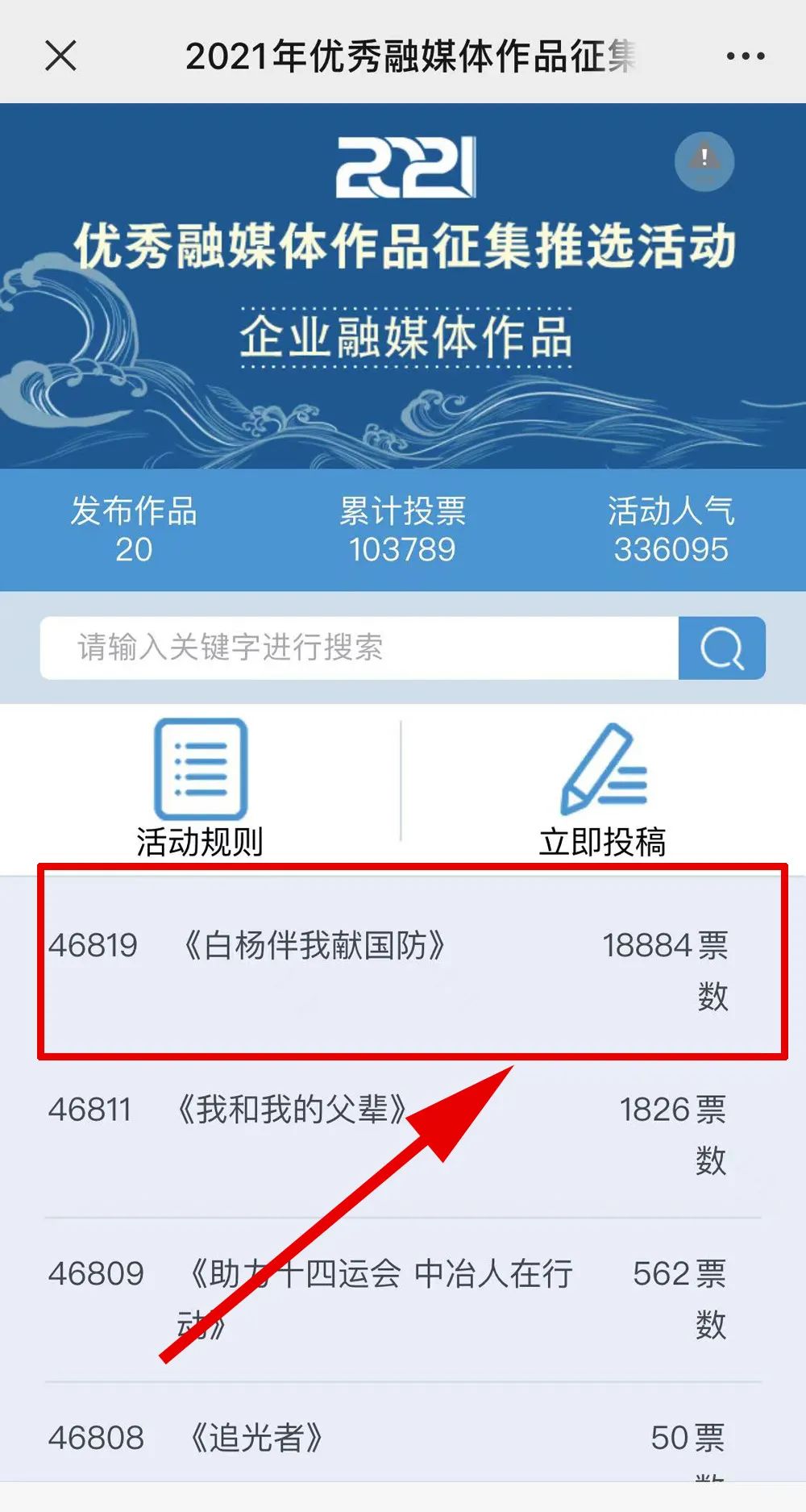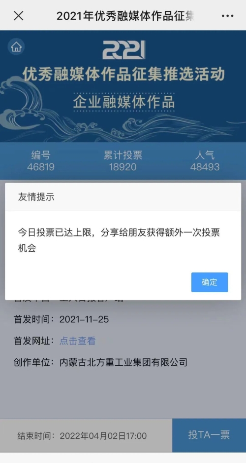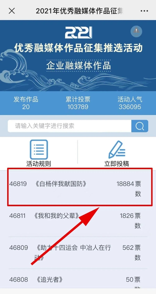 1.掃描下方二維碼,進(jìn)入初始界面,點(diǎn)擊“企業(yè)融媒體作品征集”,進(jìn)入投票界面點(diǎn)擊《白楊伴我獻(xiàn)國(guó)防》,點(diǎn)擊“投TA一票”;