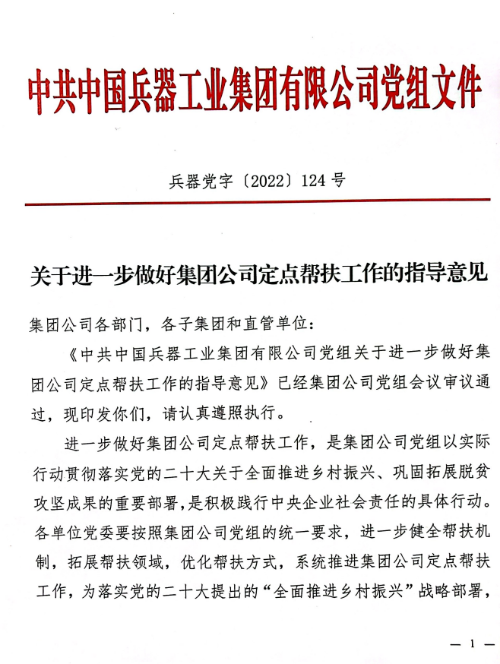 2022年,根據(jù)《中共中央 國務(wù)院關(guān)于實(shí)現(xiàn)鞏固拓展脫貧攻堅(jiān)成果同鄉(xiāng)村振興有效銜接的意見》《關(guān)于堅(jiān)持做好中央單位定點(diǎn)幫扶工作的意見》等規(guī)定,兵器工業(yè)集團(tuán)黨組制訂印發(fā)《關(guān)于進(jìn)一步做好集團(tuán)公司定點(diǎn)幫扶工作的指導(dǎo)意見》,形成“1+8+5”兵器特色定點(diǎn)幫扶工作體系?!?”,即圍繞“助力全面推進(jìn)鄉(xiāng)村振興、建設(shè)宜居宜業(yè)和美鄉(xiāng)村”定點(diǎn)幫扶要求,“8”,即“加強(qiáng)系統(tǒng)策劃、完善幫扶長(zhǎng)效機(jī)制,發(fā)揮比較優(yōu)勢(shì)、助力鄉(xiāng)村產(chǎn)業(yè)振興,增強(qiáng)內(nèi)生動(dòng)力、助力鄉(xiāng)村人才振興,培育文明新風(fēng)、助力鄉(xiāng)村文化振興,踐行‘兩山’理論、助力鄉(xiāng)村生態(tài)振興,加強(qiáng)基層黨建、助力鄉(xiāng)村組織振興,鞏固脫貧成果、加大消費(fèi)幫扶力度,選派掛職干部、立足鄉(xiāng)村建功立業(yè)”等八項(xiàng)重點(diǎn)任務(wù),“5”,即加強(qiáng)組織領(lǐng)導(dǎo)、落實(shí)幫扶資金、做好宣傳引導(dǎo)、增進(jìn)工作交流、強(qiáng)化考核評(píng)價(jià)等五方面工作保障。