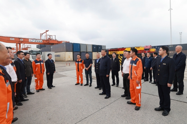 隨后,習(xí)近平來(lái)到重慶鐵路集裝箱中心站,聽取貨物集散、運(yùn)輸路徑、運(yùn)營(yíng)成本和效益等介紹,同貨車司機(jī)、列車司機(jī)、裝卸工人、場(chǎng)站管理人員等親切交流,詢問(wèn)他們的工作強(qiáng)度、勞動(dòng)保護(hù)、節(jié)假日休息和收入情況。習(xí)近平說(shuō),大家在物流一線,也是在對(duì)外開放一線,通過(guò)你們的辛勤勞動(dòng),很多商品跨越山海、走向世界,你們的工作很有意義。推動(dòng)西部大開放、促進(jìn)西部大開發(fā),物流很重要,大家要繼續(xù)努力,不斷創(chuàng)造新的業(yè)績(jī),作出新的貢獻(xiàn)。